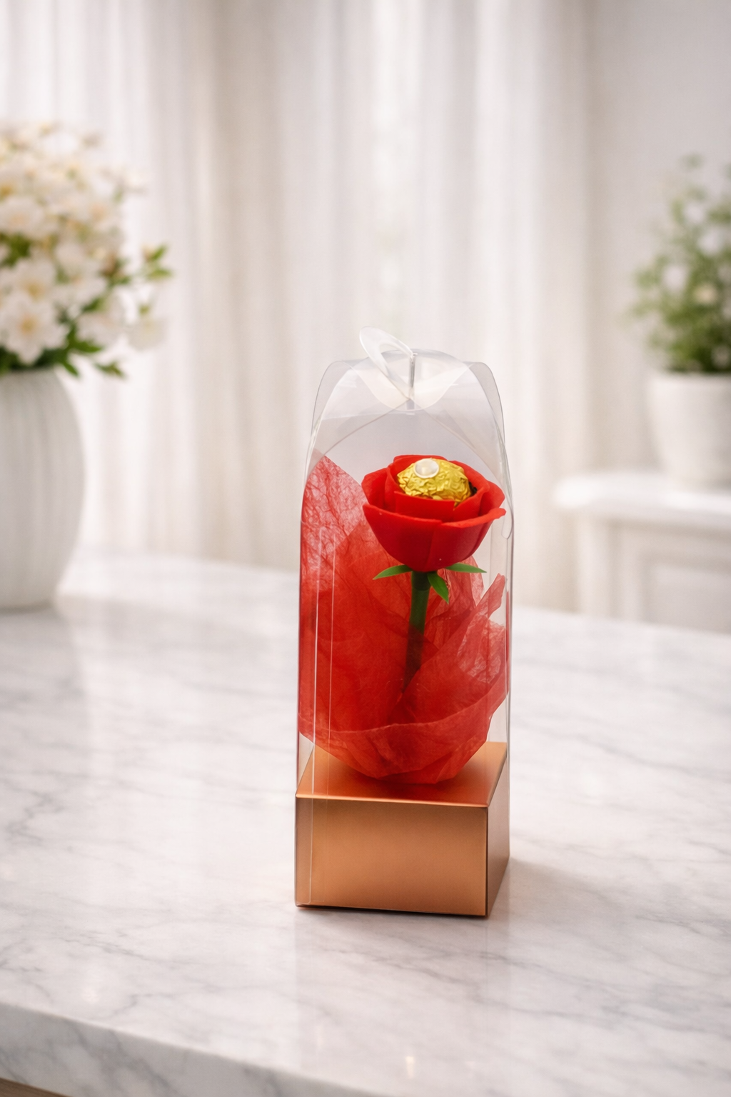 Csomagolás: átlátszó díszdoboz, piros díszpapír, arany színű talp