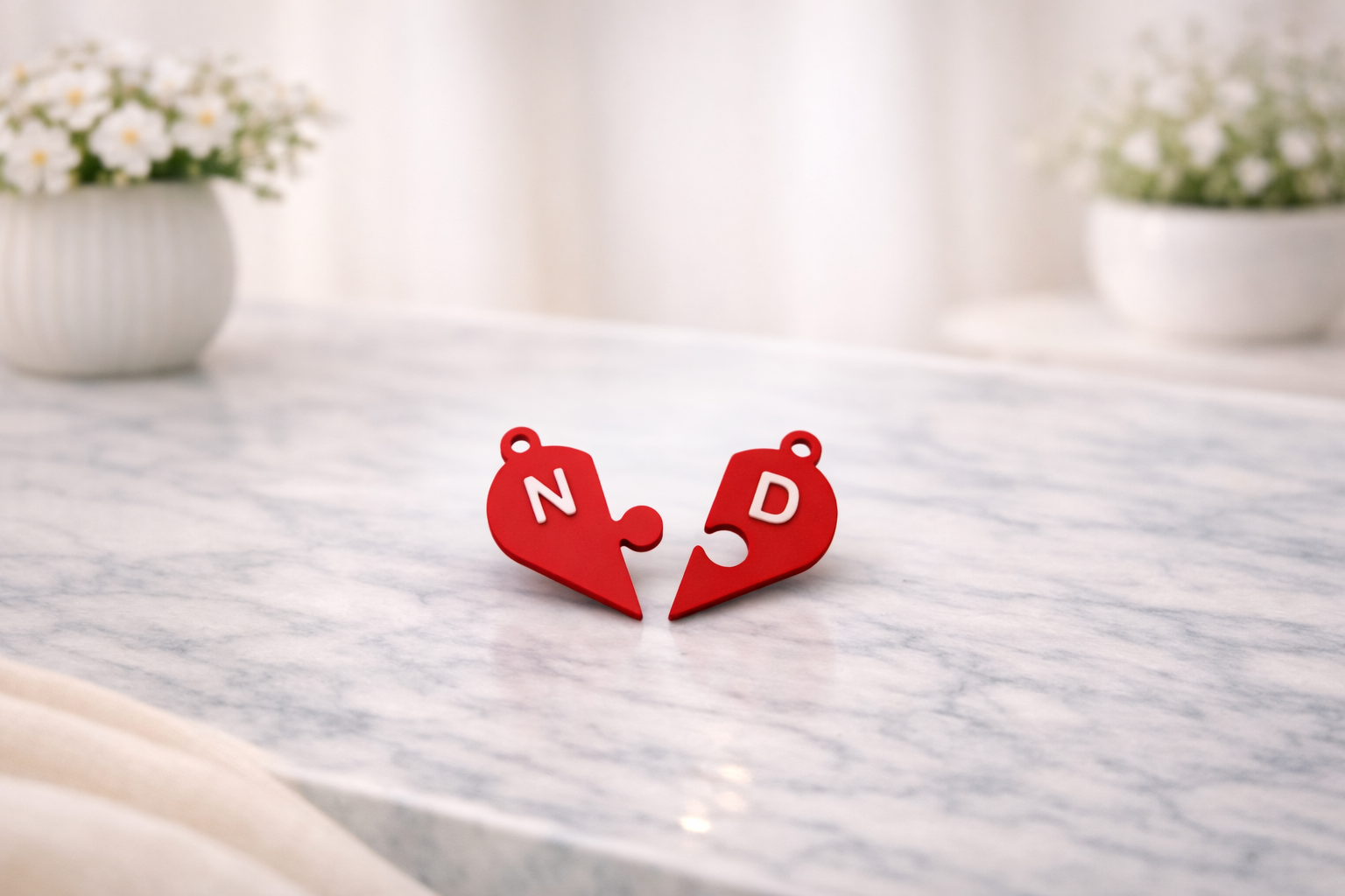 Két fél, egy történet. Ez a páros szív kulcstartó puzzle-szerűen illeszkedik össze, így mindig emlékeztet arra, hogy összetartoztok – akkor is, ha épp távol vagytok egymástól. A két rész külön-külön is hordható, a felületen pedig betűs monogram (pl. kezdőbetűk) teszi igazán személyessé.